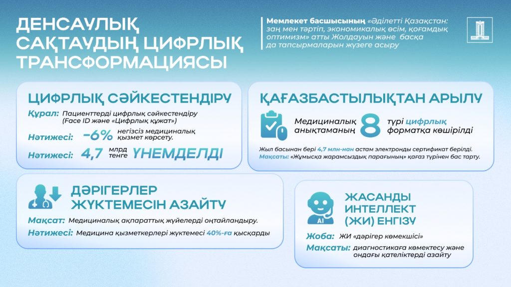 Сонымен қатар саланың цифрлық трансформациясы жүргізіліп жатыр. Бірыңғай мемлекеттік медициналық ақпараттық жүйе құрылуда. Қабылдаулар туралы жалған жазбалармен күресу мақсатында 2024 жылдың тамызынан бастап пациенттерді цифрлық сәйкестендіру жобасы («Цифрлық құжат» және Face ID арқылы) іске қосылды. Нәтижесінде негізсіз көрсетілген медициналық қызметтер көлемі 6%-ға (4,7 млрд теңгеге) азайды.