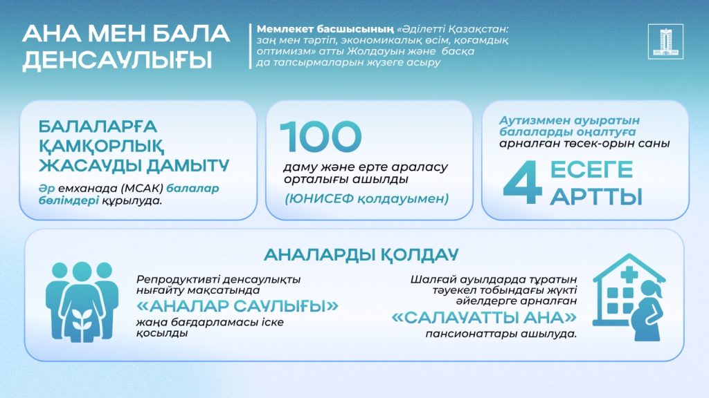 Балаларға көрсетілетін көмекті жақсарту үшін әрбір АМСК ұйымында педиатриялық бөлімдер ұйымдастырылуда. ЮНИСЕФ қолдауымен емханаларда Балаларды дамыту және ерте араласу орталықтары ашылып жатыр. Бүгінде осындай 100 орталық жұмыс істейді, онда дамуында қиындықтары бар балалар кешенді көмек алады. Балалар арасында аутизм диагнозы қойылғандар санының көбеюіне байланысты олардың реабилитациясына арналған төсек-орын саны 4 есеге артты.