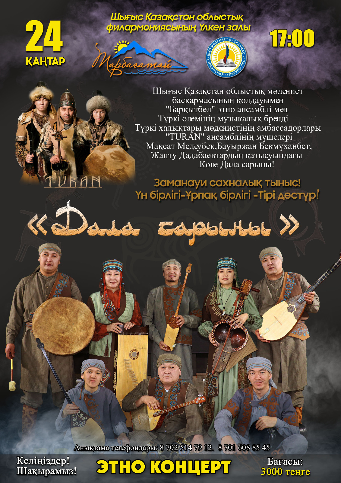 Биылғы 24 қаңтарда Өскемендегі Шығыс Қазақстан облыстық филармониясында «Дала сарыны» атты бірлескен этнофольклорлық концерт өтеді. Кеште қазақ өнерін халықаралық деңгейде танытып жүрген «Барқытбел» этноансамблі мен түркі халықтары мәдениетінің жұлдызы саналатын, әлемге әйгілі TURAN этнофольклорлық ансамблі өнер көрсетеді, деп хабарлайды F16.kz.