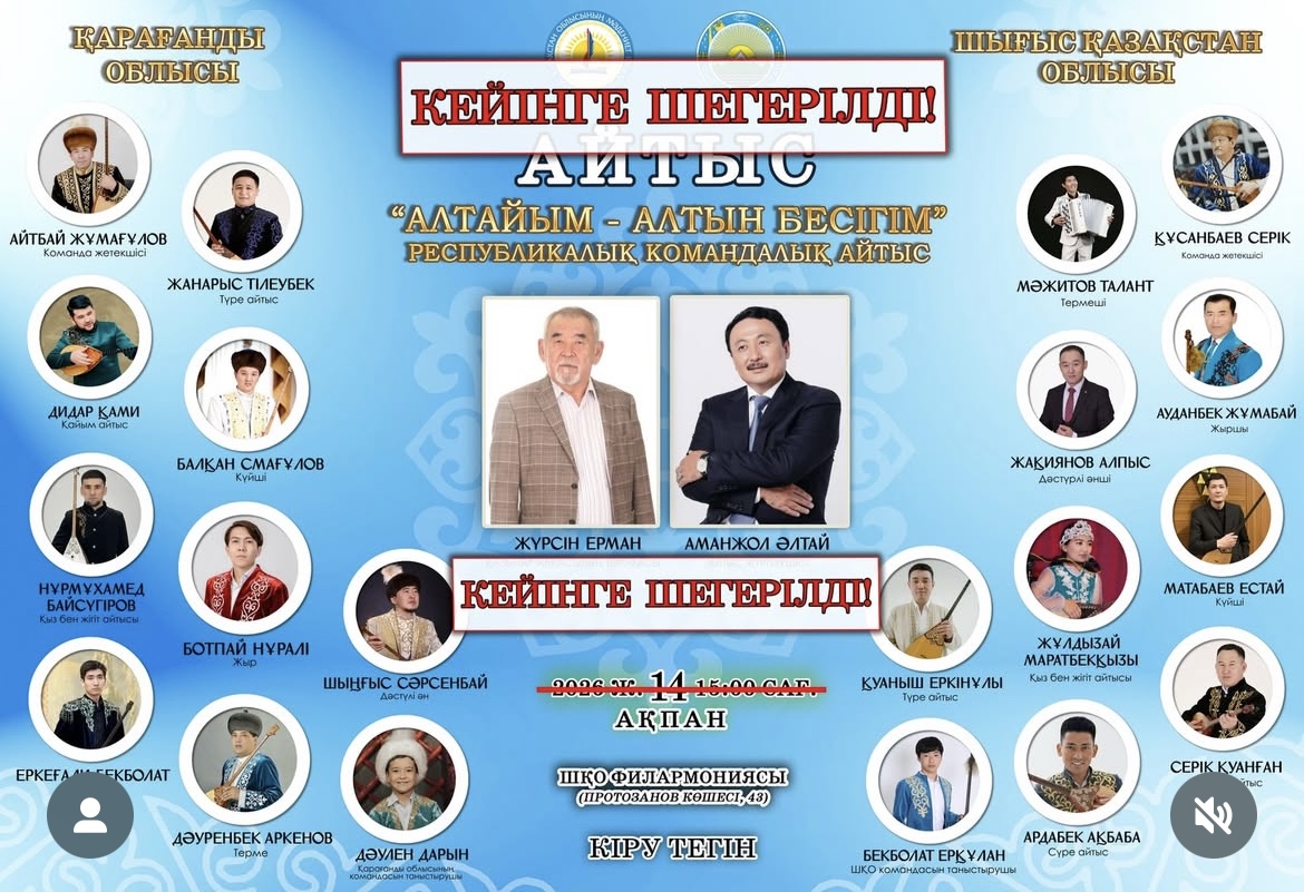 Облыс орталығында 14 ақпанға жоспарланған «Алтайым – алтын бесігім» атты республикалық командалық айтыс кейінге шегерілді, деп хабарлайды F16.kz.