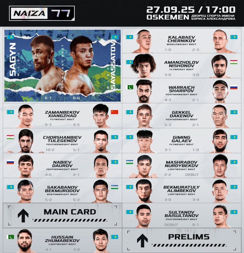 Өскеменнің Б.Алесандров атындағы спорт сарайында NAIZA 77 халықаралық турнирі өтеді. Жекпе-жек кеші 27 қыркүйек күні сағат 17.00-де басталады, деп хабарлайды F16.kz.