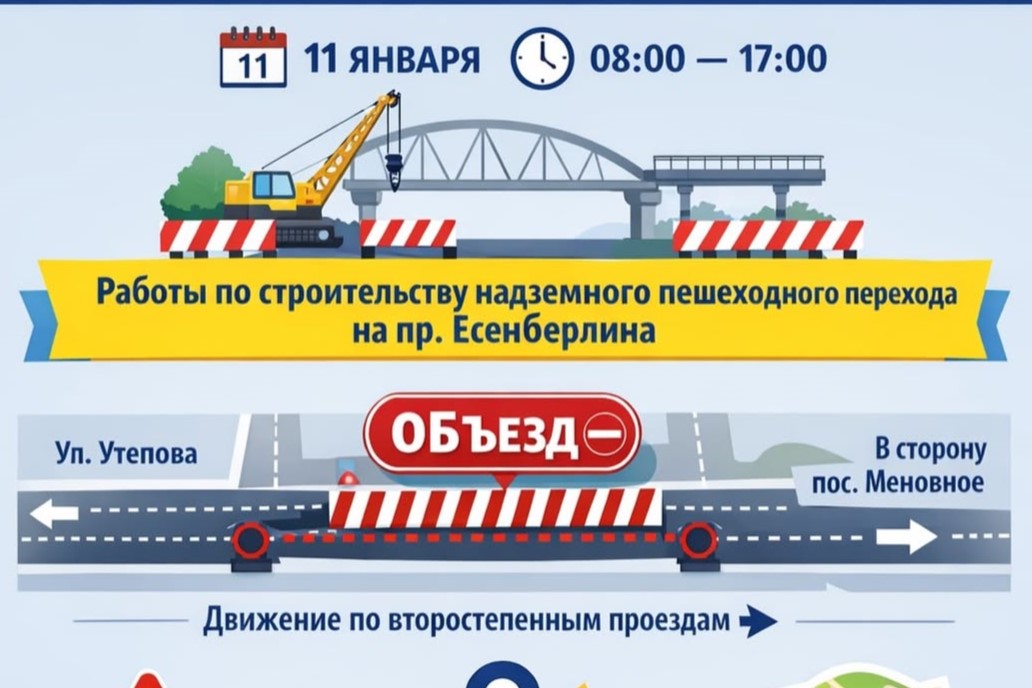 Қала әкімдігінің мәліметінше, 11 қаңтар күні сағат 08.00-ден 17.00-ге дейін Есенберлин даңғылында көлік қозғалысы өзгереді. Нақтырақ айтқанда, мектеп маңында салынып жатқан жаяу адамдарға арналған жолүсті өткелінің аралық құрылымын жылжыту кезінде кедергі келтірмес үшін шектеу енгізіледі. Жол Есенберлин даңғылының О.Бөкей көшесінен Меновное ауылына бұрылатын айналма жолға дейінгі аралықта жабылады. Бұл кезде көліктер қосалқы жолдармен жүреді. Аталған аумақта уақытша жол белгілері орнатылады.