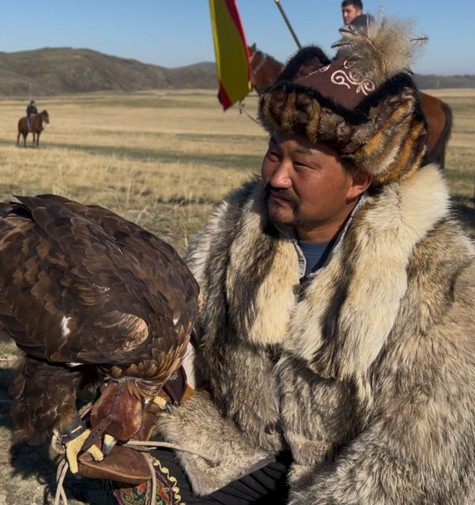 Бүркітін баптап, елге арайы келген қатысушылар ішінде Моңғолия Халық Республикасының құсбегілері де бар.